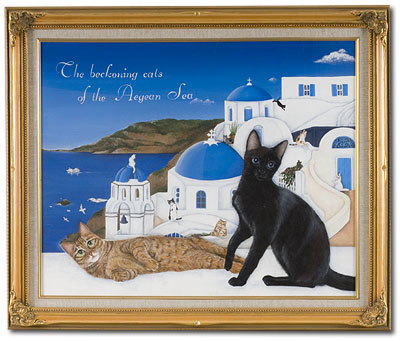 紺碧の海と白い町並みのコントラストが美しい エーゲ海の風景をバックに猫たちが招きます。 ヨーロピアンアイランドの招き猫たち。 あなたはどの猫ちゃんがお気に入り?