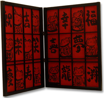 赤い和紙に黒一色で描きました。