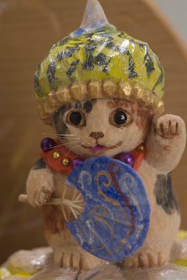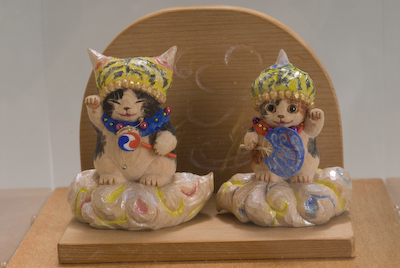 木製の招き猫にそれぞれデンデン太鼓とうちわを持たせて
