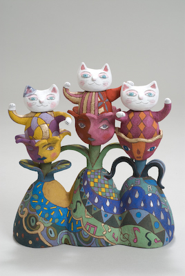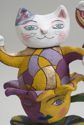 紙(張り子)、古布、粘土などの素材をつかって、郷土玩具のようなホノボノとしたモノから、幻想的なタイプのモノ、オブジェ的なモノまで、いろいろ作っています。これからも様々な手法を試みながら、私なりのネバーランドの住人達をつくりつづけていきたいと思っています。