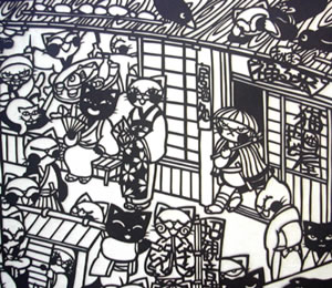 主に切り絵の画法で猫というモノを描く。紙を切るというシンプルな技法で、どこまで猫のしなやかさ・美しさが表現できるか、試行錯誤の日々だけれどそれが楽しみでもあるのです。そして時折、紙に「ことば」も刻みます。日本の文字は美しい絵であり、大事に残してゆきたいモノです。生きている猫と文字を、意思を持った猫を、物語のある猫たちを、作ってゆきたいと思います。
