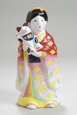 土人形作者(江口土人形)でもある、福次郎がその技法を生かして制作した「招き猫を抱く娘」