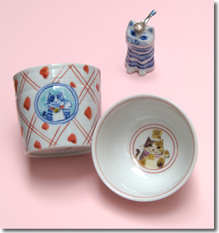 思いがけないところに隠れている猫、カラコロと涼しげに鳴るワイングラス・・・・洒落た色使いと遊び心。伝統工芸の九谷焼に全く新しい息吹を吹き込む陶芸家・さなぼこと東早苗さん。気ままな猫たちが、使いやすいカップやお皿などの器になりました。 |