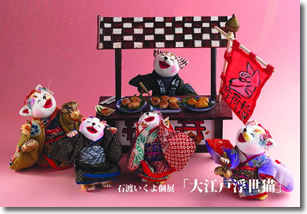 今回は、江戸縮緬古裂をまとった猫の人形で生き生きと表現された、華やかな江戸市中の魅力。人の世のありようを猫の姿ですくいとって見せてくれる、石渡いくよさんの立体浮世絵の世界です。