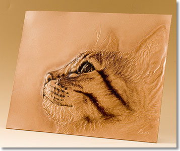 ”レザーカーヴィング”という手法で、革を素材に毛並みやヒゲの先まで精密に描いた猫たちの肖像は、優美さと野性味を兼ね備えています。