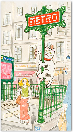 小粋なパリの街角の風景の中を招き猫が闊歩します。京都在住の画家・はしもと美子さんが、ひと夏PARISで暮らした時の日常を、猫の姿を借りて表現しました。水彩やアクリルの他、パリで集めた紙類を使ったパピエ・コレ(コラージュ)など約20点を出品予定。