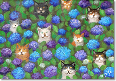 布施和佳子さんが描いた瑞々しいあじさいの花と、表情豊かな猫たちがキャンバスノート(ブックカバー)で楽しめます。
