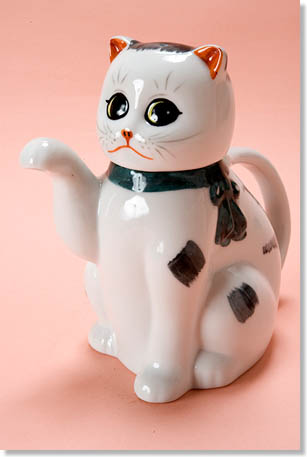 国産で大正〜昭和初期の品と思われる(中国製の可能性もあり)黒いつぶらな瞳が可愛い猫のポットを、瀬戸のやきものの技術で復刻(株式会社中外陶園)。挙げた前足が注ぎ口になっている。