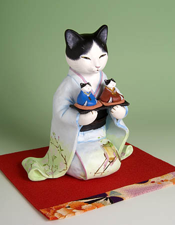 縮緬古裂の衣裳雛をはじめ、陶磁や七宝の作品、そしてユーモラスな豆雛まで、アーティストの創意あふれる猫のおひなさまが勢揃いします。
