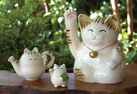 「猫のカップや器、小物類、そしてテー ブルに椅子と、楽しい猫だらけのカフェを展開したいと思っています。もちろん皆さまにお越しいただけるよう“招き猫”もお待ちしています」 明るく伸びやかな猫たちが笑顔を運ぶ陶芸作家 はら・かおりさんの世界。