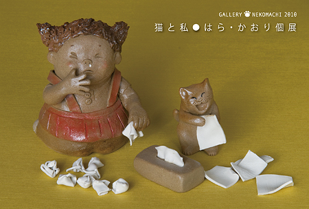 「猫と人とのちょっとやさしくて、ちょっと楽しい関係を描いた人形達と、ふっくらした幸福な猫たちを連れて伺います。」 伊豆・河津の豊かな自然に囲まれたアトリエで作陶されている、はら・かおりさんの個展です。