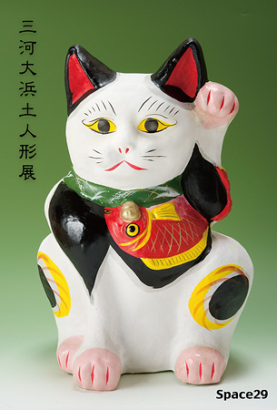 | 三河系土人形の招き猫は、大きな耳と目、正面を向いてどっしりと構えた姿が特徴です。二代目没後、しばらく途絶えていた愛知県碧南市「大浜土人形」の制作を引き継ぎ、今春から本格的に活動を始められた三代目禰宜田 徹さん。伝統を踏まえながら自分なりの表現を、と思いを込めた作品の数々をご覧下さい。