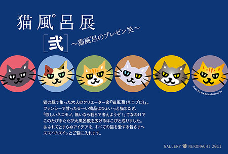 猫の縁で集まったデザイナー、イラストレーターなど6人のクリエーター集団『猫風゜呂(ネコプロ)』。よくあるファンシーで 甘ったるい猫グッズはひょいと猫またぎ、「欲しい猫グッズが無いなら、自分たちで考えちゃおう!」と大風呂敷を広げることに相成りました。今回はオリジナル猫柄パターンなど、「こんな猫モノが あったらいいな」というアイデアをプレゼンテーションいたします。毛色の変わった猫グッズ案をお探しの企業様、谷中猫散歩の皆様、猫町ギャラリーファンの皆様−−全ての猫を愛する皆様を、ゴロンとお腹を見せて大歓迎〜。