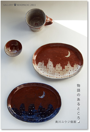 赤絵描き落としの手法を用いた器(マグカップ・カップ・皿・ピッチャー・その他)を中心に展示。物語を感じられるような立体作品や、招き猫・ブローチ・ペンダント・マグネット等の小物、イラストなどの平面作品も出展