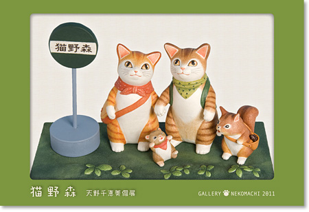 | 「森の入口の細い坂道を登ると、そこは「猫野森」バス停……小さな仲間達と暮らす不思議な猫達を立体で表現します。 また、自然の中で悠然と時を生きる猫達を四季の植物と共に絵にしたいと思います」