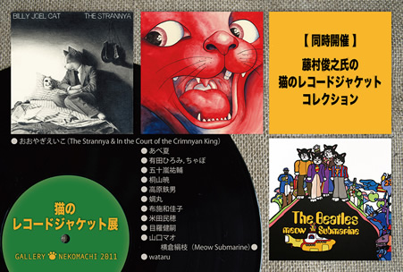 藤村俊之氏の猫のレコードジャケットコレクション展示と、13人のアーティストによるレコードジャケットのデザイン、原画、立体など、猫と音楽をテーマにしたグループ展です。